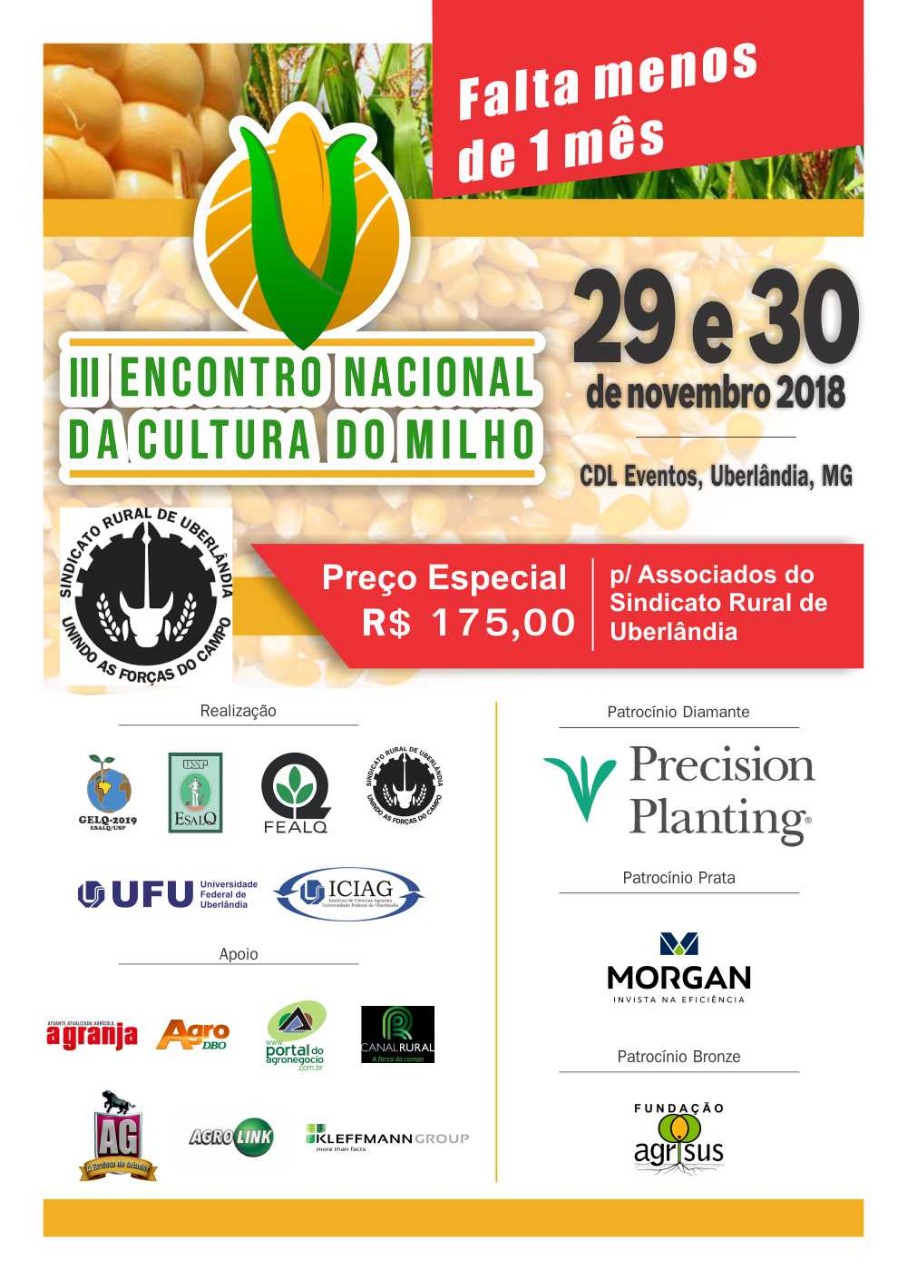 O “III Encontro Nacional da Cultura do Milho” acontecerá em Uberlândia nos dias 29 e 30 de novembro, e você, associado do Sindicato Rural de Uberlândia não pode ficar fora dessa! Em parceria do GELQ 2019 com o Sindicato Rural de Uberlândia, foi liberado um lote de inscrições com...