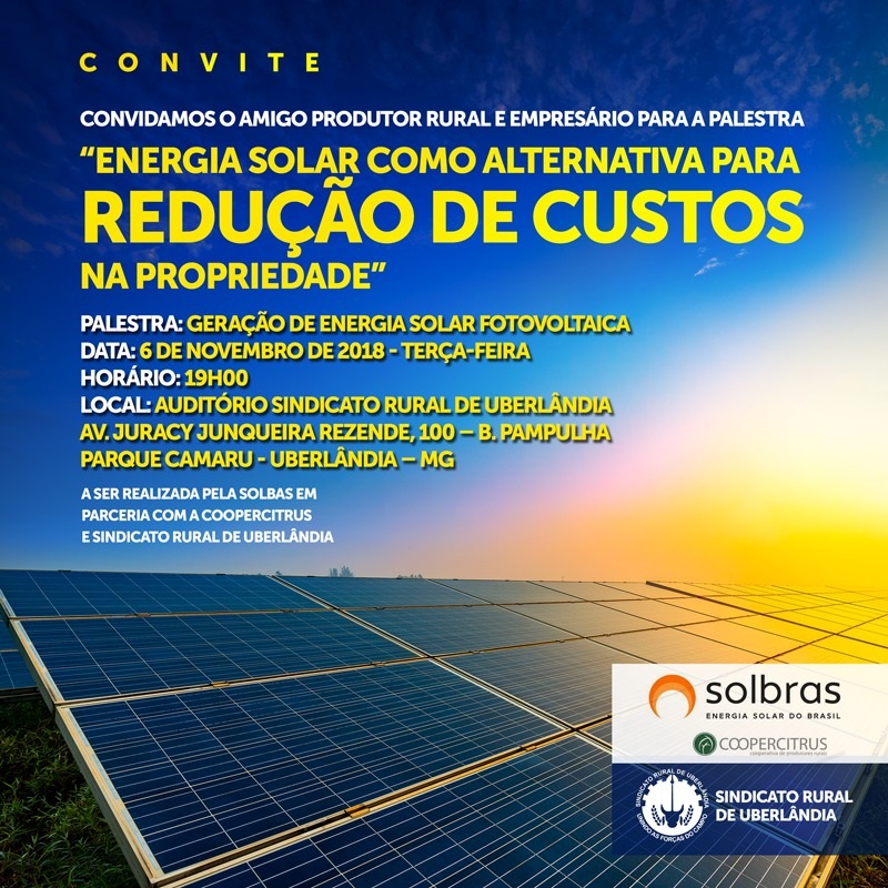 Modelo é apresentado como alternativa para redução de custos em propriedades rurais A geração de energia fotovoltaica será tema de palestra na próxima terça-feira, dia 6 de novembro, às 19 horas, no auditório do Sindicato Rural de Uberlândia. O assunto será apresentado por Rui Ruas, diretor comercial da empresa...