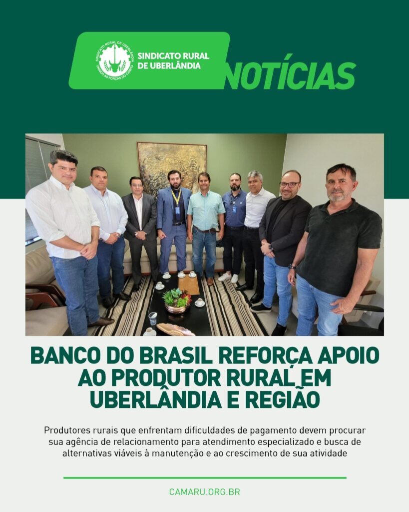 Em reunião realizada no Sindicato Rural de Uberlândia, o presidente Thiago Fonseca, o vice-presidente Claudionor Nunes, acompanhados do secretário municipal de Agronegócio, Thiago Silveira, receberam dirigentes do Banco do Brasil para discutir medidas de apoio ao setor agropecuário. Na ocasião, o banco anunciou novas concessões de crédito destinadas à agricultura familiar, além de médios e grandes produtores rurais, com foco em custeio e investimento. A iniciativa reforça a proximidade e o compromisso do banco com todos os perfis de produtores, em todos os momentos. A ação mobiliza diferentes áreas e equipes técnicas do banco, reafirmando seu compromisso com o desenvolvimento do agronegócio em Uberlândia e região.
